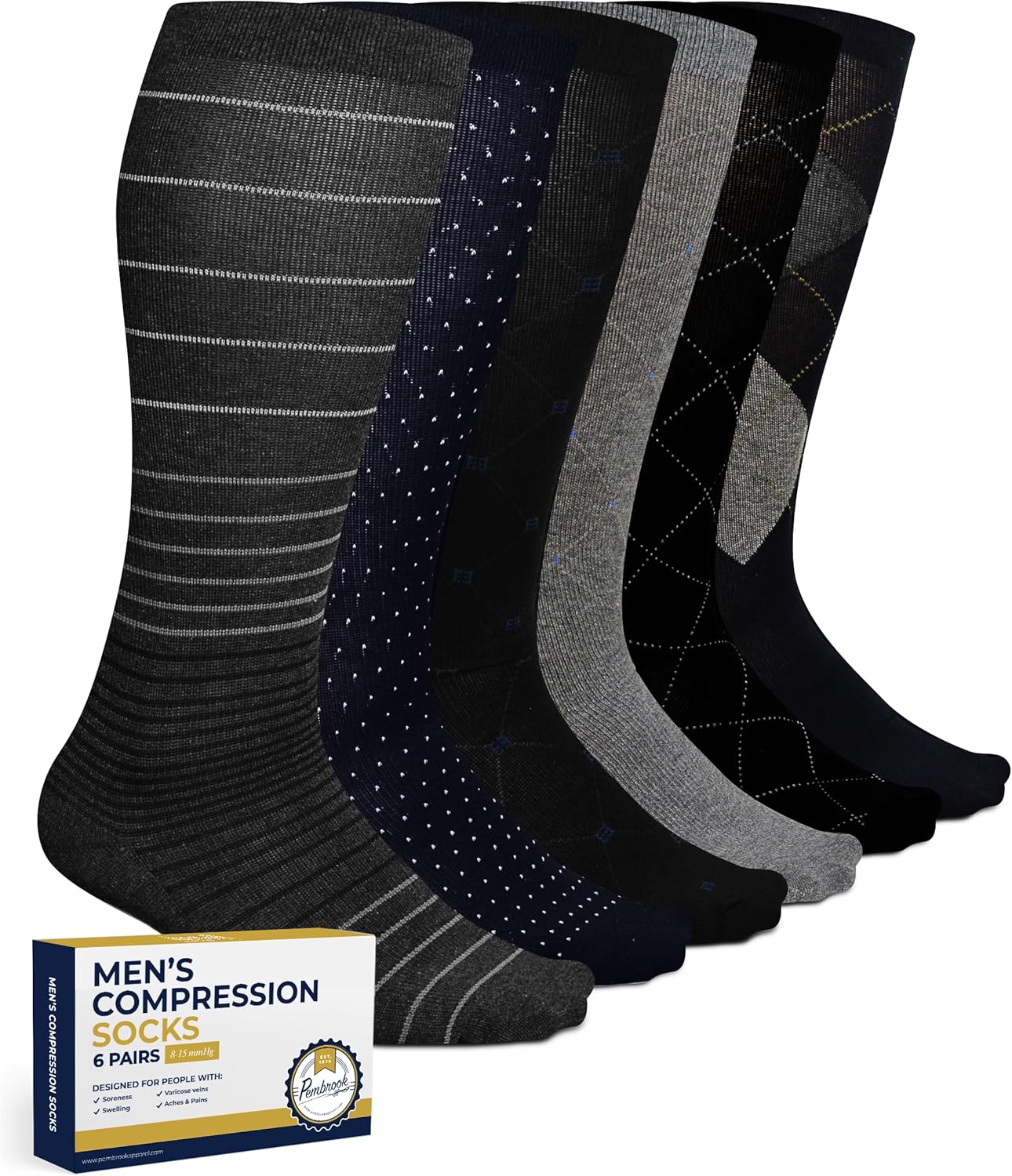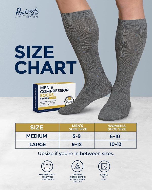 Introducing the Pembrook Light Compression Socks for Men, a premium set of 6 pairs designed to provide unmatched comfort and support throughout the day. These 8-15 mmHg graduated compression socks are tailored to fit men sized 9-12, offering a perfect blend of style and functionality.