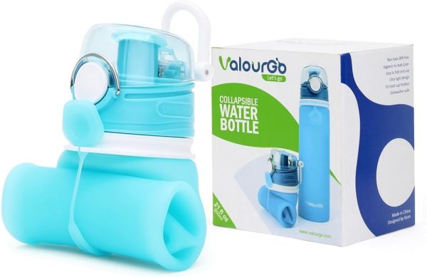 Valourgo Collapsible Water Bottle, Silicone Foldable with Leak Proof Valve BPA Free, Aqua Blue, 21 oz